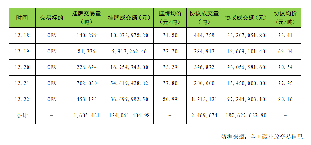 本周(12月18日至12月22日)全國碳市場(chǎng)綜合價(jià)格行情為:最高價(jià) 81.03 元/噸,最低價(jià) 71.40 元/噸,收盤(pán)價(jià)較上周五上漲13.02%。本周掛牌協(xié)議交易成交量 160.54 萬(wàn)噸,成交額 1.24億元;大宗協(xié)議交易成交量 246.97 萬(wàn)噸,成交額 1.88 億元。本周全國碳排放配額總成交量 407.51 萬(wàn)噸,總成交額 3.12 億元。截至本周,全國碳市場(chǎng)碳排放配額(CEA)累計成交量 4.35 億噸,累計成交額 244.15 億元。具體交易情況如下: